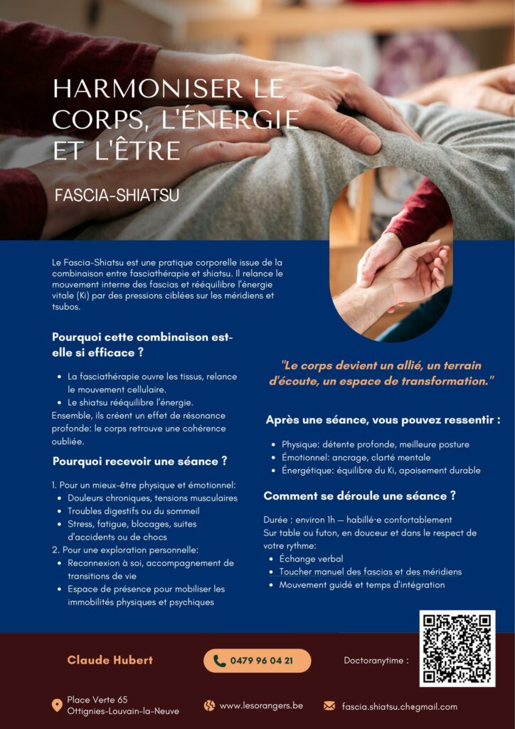 Fasciathérapeute & shiatsu. Blocages, stress, fatigue, douleurs chroniques, etc. Consultations le mercredi à Kiné Cosy, Louvain-la-Neuve. 0479 96 04 21, Complémentaire à la kiné et psy.