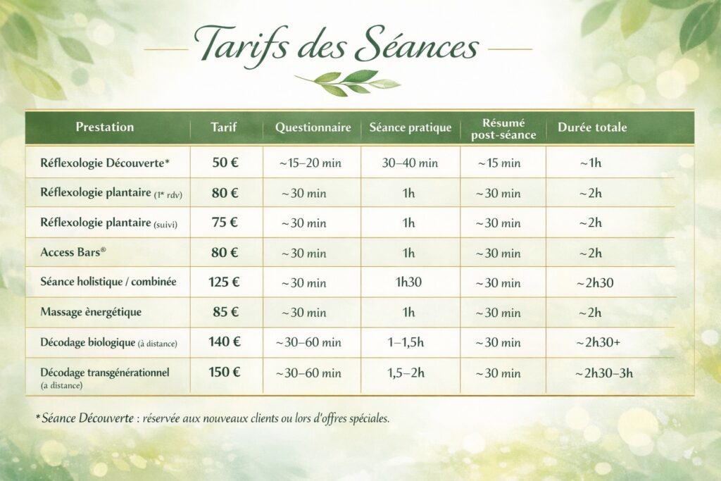 Les séances débutent par une anamnèse personnalisée et se concluent par un résumé écrit avec recommandations, permettant une meilleure intégration des effets du soin et un soutien concret au quotidien.